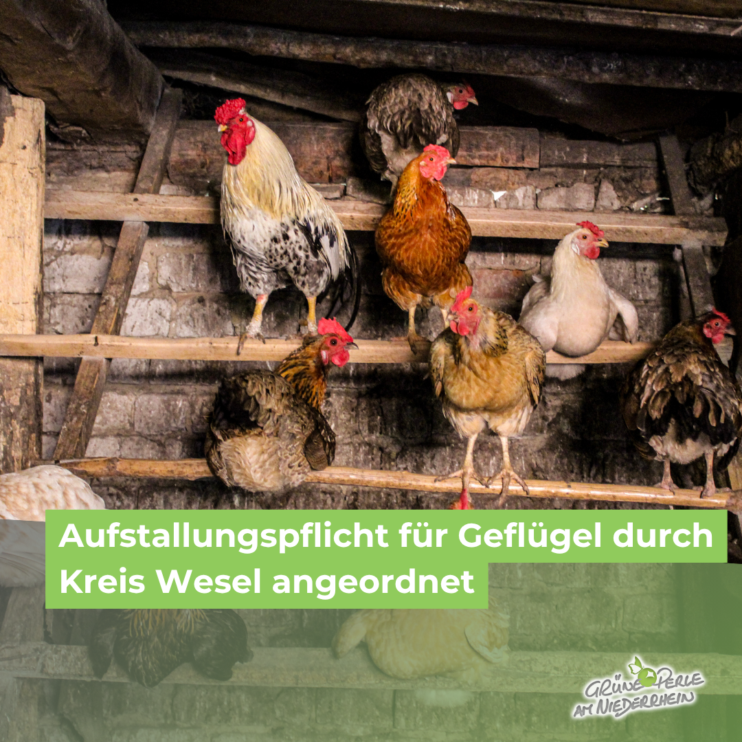 Aufgrund des aktuellen starken Aufkommens der Geflügelpest und der dadurch bestehenden Gefahr für Geflügelhaltungen hat der Kreis Wesel am 30.10.2025 mit Wirkung ab dem 31.10.2025 die kreisweite Aufstallung von Geflügel angeordnet.