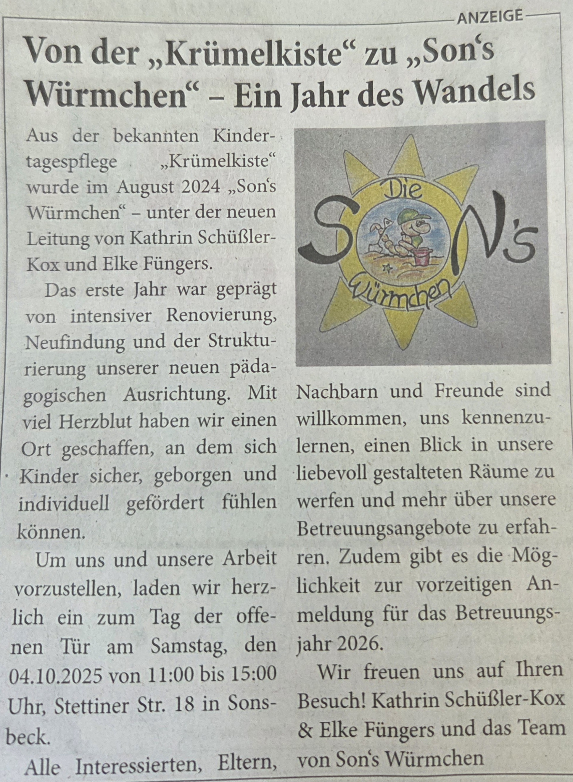 Kathrin Schlüßler-Kox und Elke Fünger - das Team der SON'S Würmchen laden ein zum Tag der offen Tür.