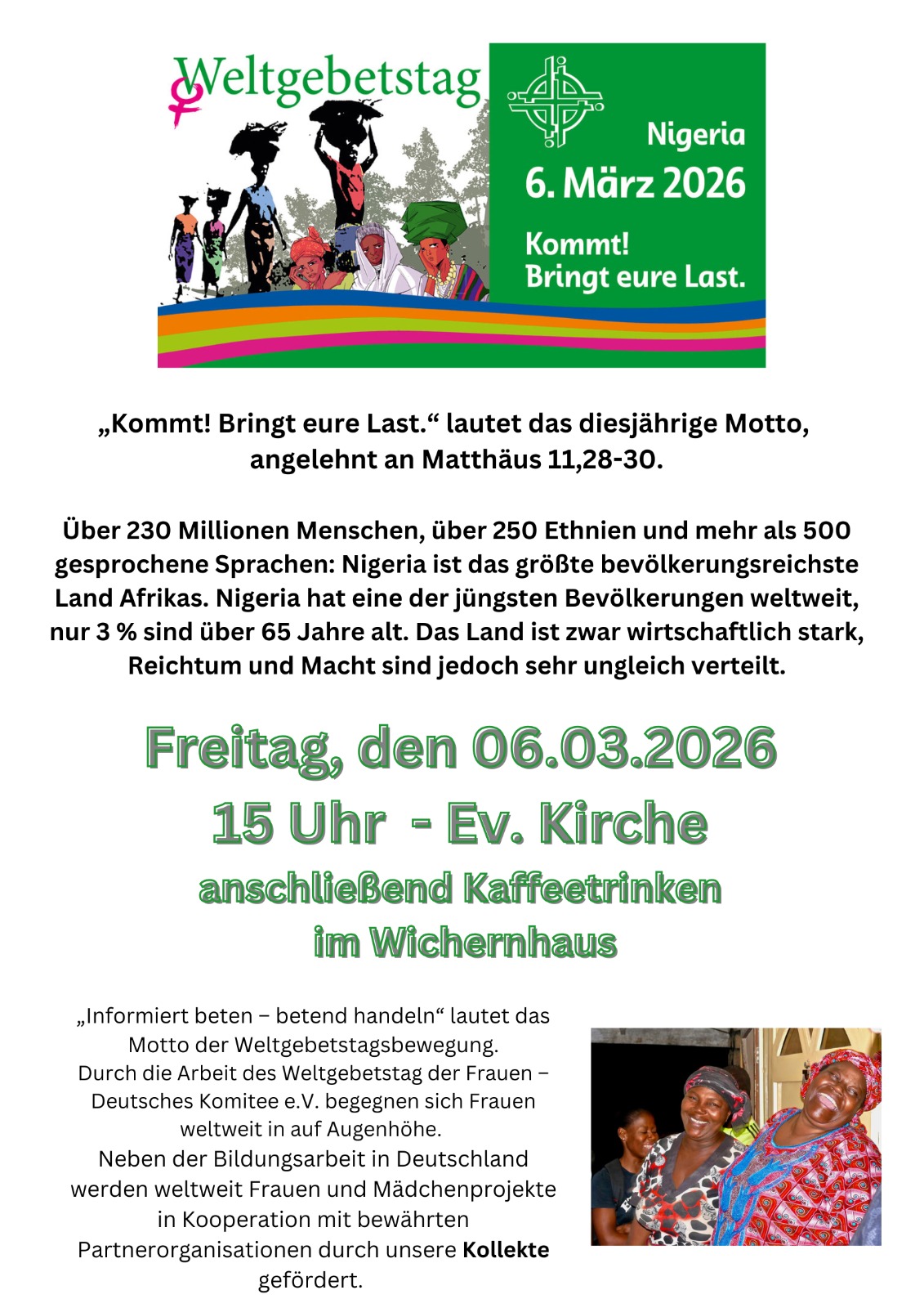 Weltgebetstag der Frauen in der Evangelischen Kirche mit anschließendem Kaffeetrinken im Wichernhaus.